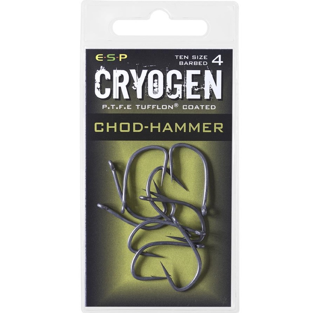 ‘- PTFE coated Chod-Hammer carp hooks – Incredibly sharp long needle point – Very strong shape highly unlikely to open or snap – Subtly out turned eye – Perfect for tying the knotless knot with stiff hook link materials – Larger sizes will take 25lb bristle filament three times through the eye – Pack of 10