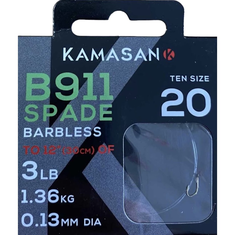 ‘- Kamasan B911 Barbless Heavy Hooks to Nylon – Wide gape Nickel – Long swept point – Medium gauge Carbon wire – Chemically sharpened needle point hooks – Tied to Kamasans extra fine extra strong mono – Barbless – 8 per pack