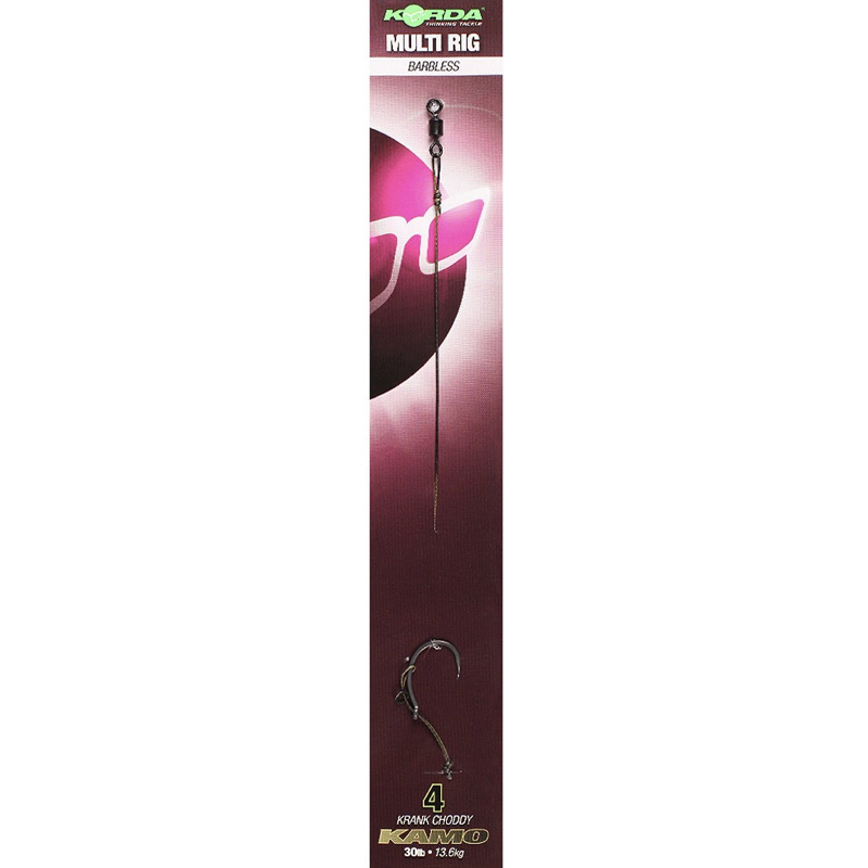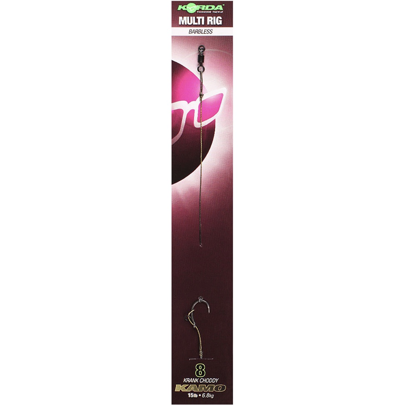 The Korda multi rig barbless is a great option for carp anglers who want a versatile and effective rig. The rig is tied with a Kamo coated braid that is strong and abrasion-resistant, and it is fitted with a Krank Choddy hook, which is a sharp and strong hook that is perfect for pop ups and boilies. The wide gape and sweeping shank of the hook help to ensure a secure hook hold, even when the carp is fighting.