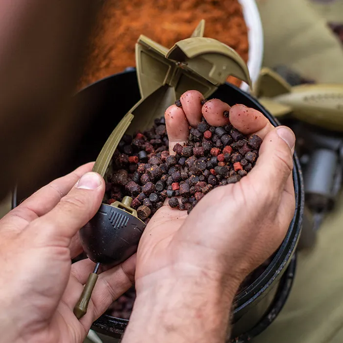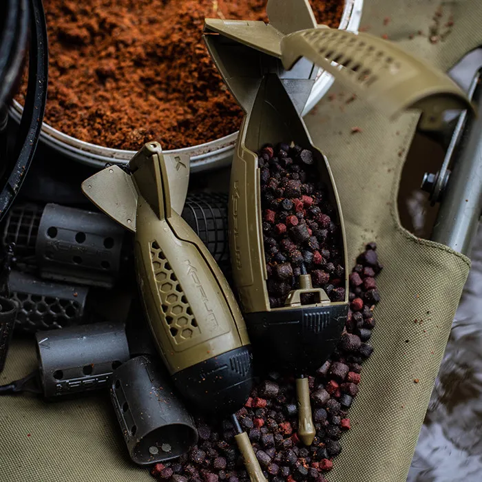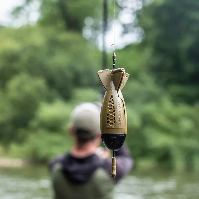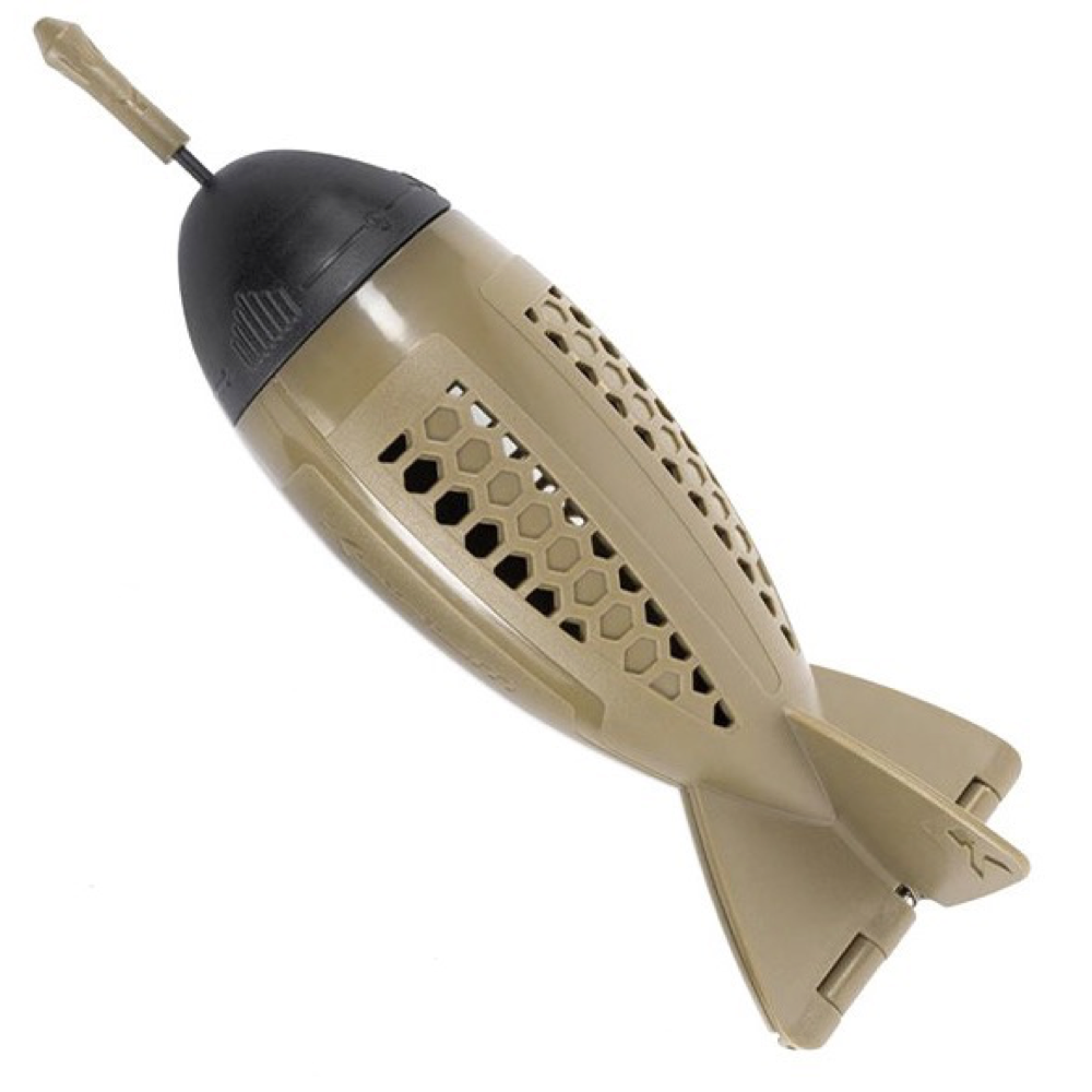 Spod with interchangeable weighting system Simple to adjust diving speed and weight Internal loading port; Doughnut shaped weights Springing trap door Easy to retrieve in fast flowing water