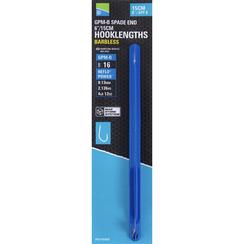 ‘- Taking hook length design and storage to the next level – Rigs suitable for all anglers – 8 hand tied rigs which are stored on the rig stick – Easily identified by the attached sticker – GPM-B Barbless hooks to Reflo Power line – Suitable for baits from maggots and small pellets through to meat, corn and big worms